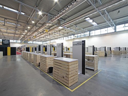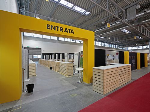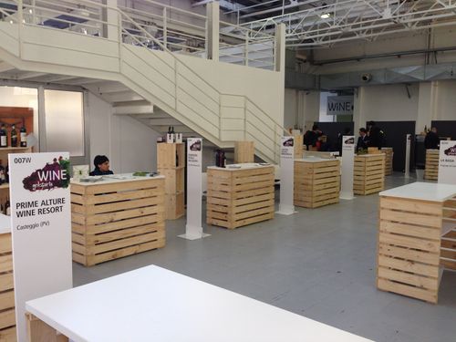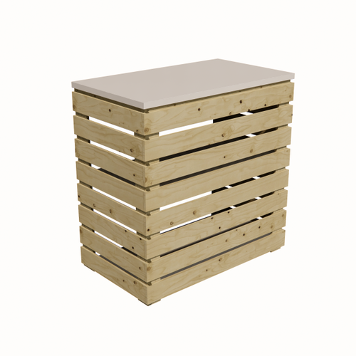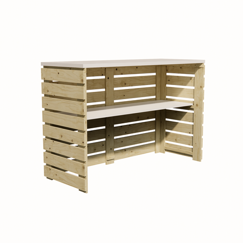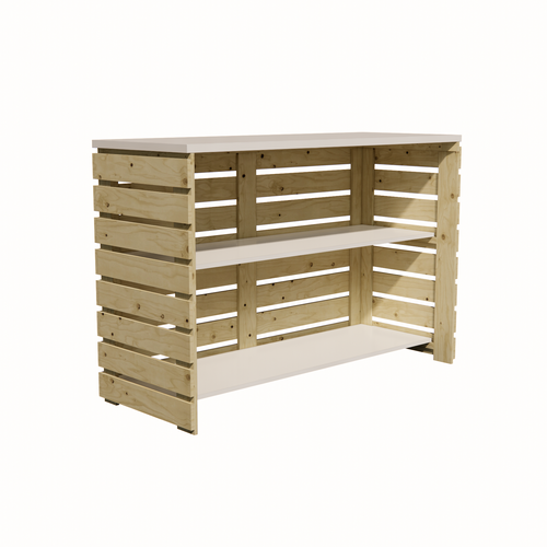 Spruce reception with visible slats. Shelf in melamine. Ideal for environments with a natural mood.