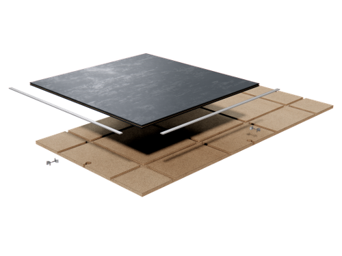 La struttura della pedana Wood è una evoluzione sapiente delle comuni pedane con sottofondo in truciolare. Si compone di un abaco di 4 quadrotte base delle dimensioni di 100x200 cm (centrale), 100x50 cm (di bordo), 200x50 cm (di bordo) e 50x50 cm (angolare), realizzate in legno truciolare ignifugo e caratterizzate dalla presenza di un reticolo fresato per l’alloggiamento dell’impianto elettrico; ogni quadrotta è dotata di particolari perni di fissaggio che permette la connessione con la quadrotta adiacente. Lo spessore complessivo della struttura è di 2.2 cm.